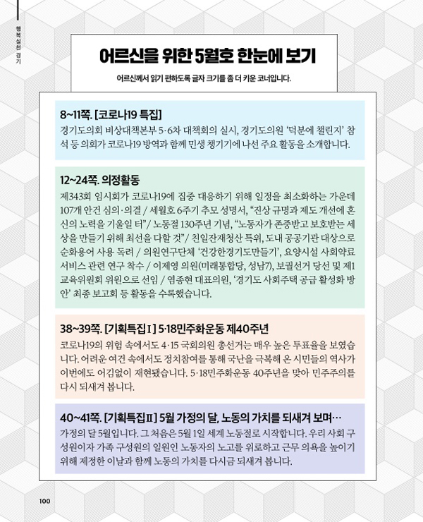 경기도의회가 발행하는 소식지 ‘경기도의회’에 눈이 불편한 어르신들을 위해 글자 크기를 키운 지면이 새롭게 마련된다.
