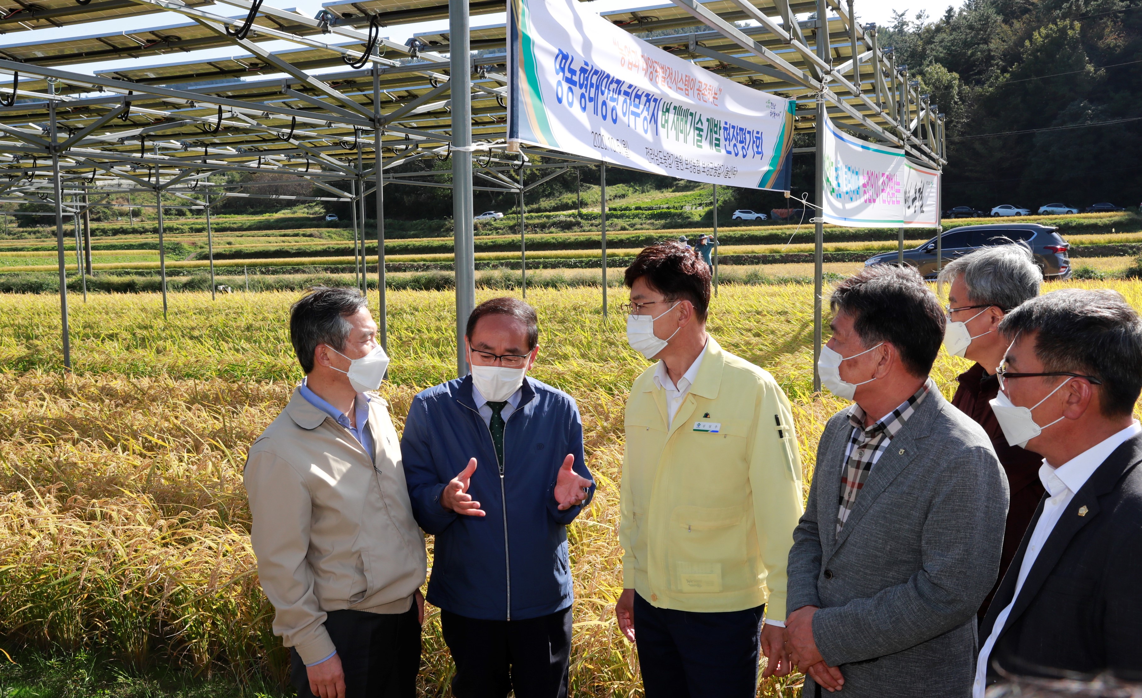 5일 김철우 보성군수가 보성읍 옥암리 일대 영농형 태양광 하부경지 벼 재배기술 개발 현장을 찾아 박홍재 전남농업기술원장의 설명을 듣고 있다.