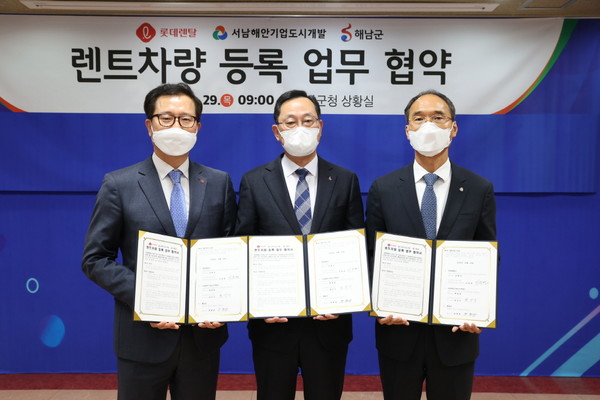해남군은 29일 군청 상황실에서 롯데렌탈(주), 서남해안기업도시개발(주)와 렌트 차량 등록 업무협약을 체결했다.