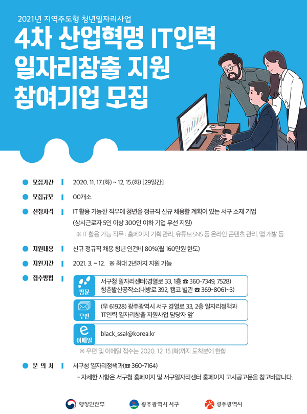광주 서구가 IT 분야에 청년을 정규직으로 신규 채용한 기업에 인건비를 지원하는 '4차 산업혁명 IT인력 일자리창출 지원사업'을 추진한다.