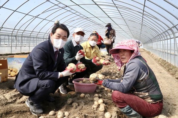 부안 노을감자 수확이 한창인 가운데 권익현 부안군수가 5일 노을감자 수확 현장을 방문해 농가와 함께 수확의 기쁨을 나눴다.