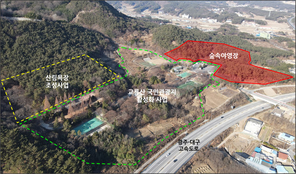 교룡산국민관광지 주차장 주변의 시유지에 기존 소나무 숲을 활용한 숲속야영장(글램핑돔, 데크사이트, 쇄석사이트)과 편의시설(화장실, 음수대등), 데크산책로, 숲속쉼터 등을 조성할 계획이다.