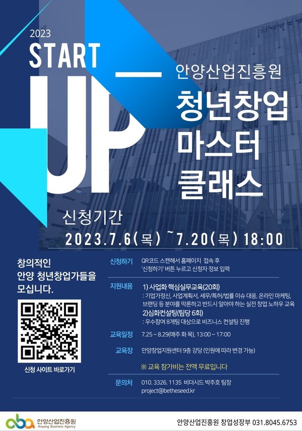 안양산업진흥원은 청년·창업기업 사업화 컨설팅 지원사업의 일환으로 ‘청년·창업 마스터 클래스’ 참여기업을 20일까지 모집한다고 17일 밝혔다.