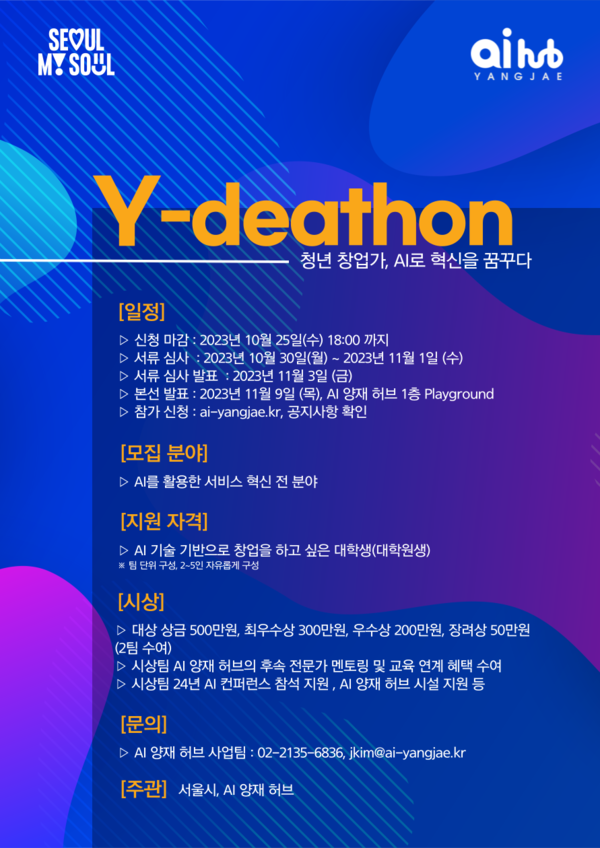 ‘서울 AI Young 포럼’은 ▲인공지능 분야 스타트업 창업가의 강연과 대담 ▲ 전국 주요대학 인공지능 전공 대학생, 창업동아리를 위한 ‘AI 동아리 아이디어톤 대회’ 결선 ▲ AI양재허브 입주기업과 AI동아리(동호회), 대학생 간 멘토링 등으로 진행된다.