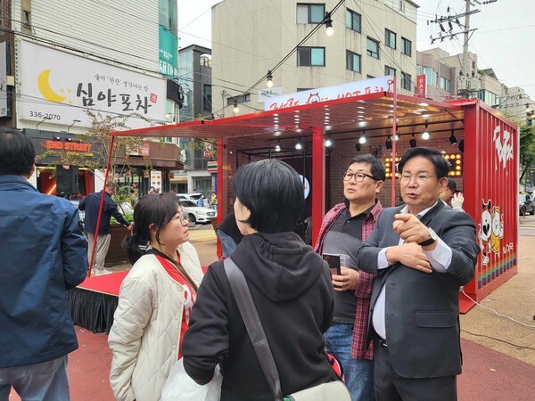 박강수 마포구청장이 ‘레드로드 댄스 페스티벌’의 둘째 날인 8일 오후, 공연 준비가 한창인 ‘레드로드 핫 포차’를 찾았다.