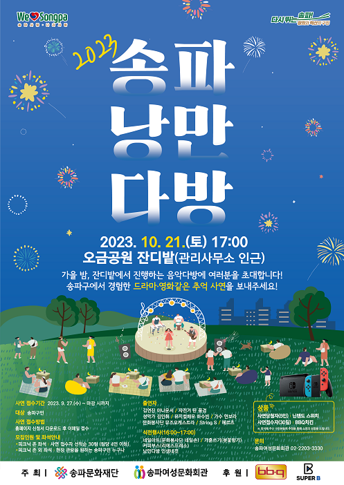 송파구는 오는 21일 17시부터 오금공원 잔디마당에서 송파여성문화회관 가족페스티벌 ‘2023 송파낭만다방’을 개최한다고 밝혔다.