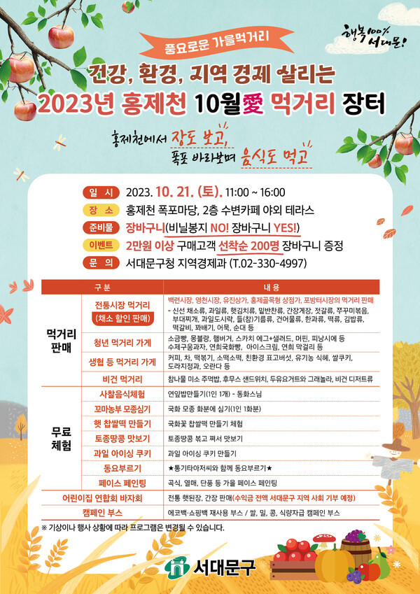 서대문구가 서울의 핫플레이스로 떠오른 홍제천 수변 카페 야외 테라스(2층)와 폭포마당(1층)에서 이달 21일 토요일 오전 11시부터 오후 4시까지 ‘10월愛 먹거리 장터’를 개최한다.