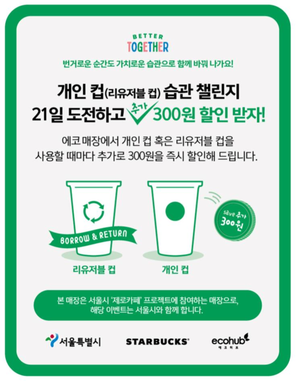 서울시가 2023년 9월부터 전국 최초로 실시한 ‘개인 컵 사용 추가 할인제’의 연장선으로 4일부터 스타벅스 36개 에코 매장과 함께 개인 컵 사용 시 700원을 할인해주는 ‘도전! 개인 컵(다회용 컵) 사용 21일’ 이벤트를 시작한다.