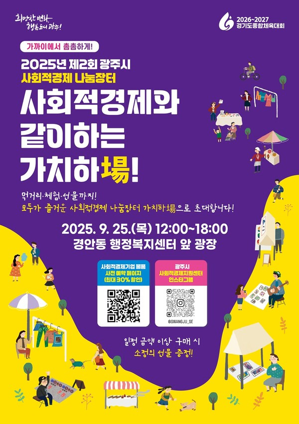 광주시는 오는 25일 낮 12시부터 오후 6시까지 경안동 행정복지센터 앞 광장에서 ‘2025년 제2회 광주시 사회적경제 나눔장터(별칭: 사회적경제와 같이하는 가치하場!)’를 개최한다고 15일 밝혔다.