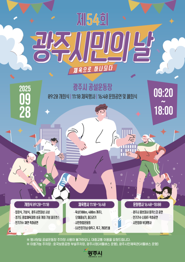 광주시는 오는 28일 광주시공설운동장에서 ‘제54회 광주시민의 날’ 행사를 개최한다고 19일 밝혔다.