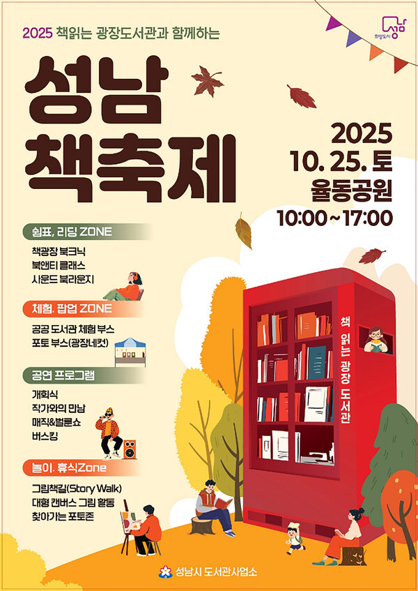 성남시는 오는 10월 25일 오전 10시~오후 5시 분당 율동공원 내 잔디광장에서 ‘2025 성남 책 축제’를 연다.