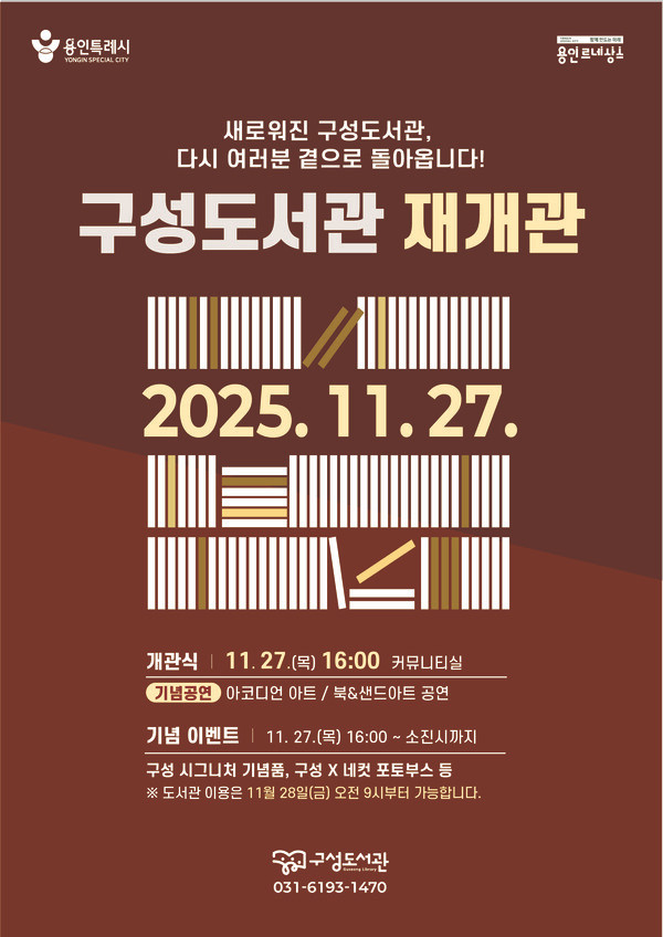 이상일 시장은 “조아용 포토부스 ‘구성X네컷’, 독서포인트 1000P 지급, SNS 인증 이벤트 ‘구성구석 챌린지’ 등 이벤트가 운영되고, 방문객에게 백북 등 기념품이 제공된다”며 “리모델링 특화 기념으로 한소원 서울대 교수 온라인 강연도 진행되며, 신청은 홈페이지에서 가능하다”고 말했다.