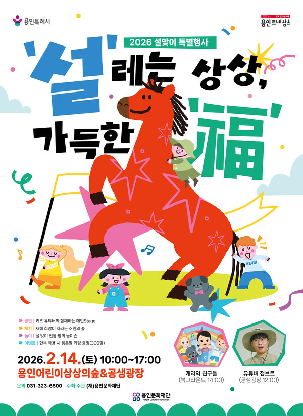 용인문화재단은 2026년 설 명절을 맞아 2월 14일, 용인어린이상상의숲과 용인문화도시플랫폼 공생광장 일원에서 설맞이 특별행사 ‘설’레는 상상, 가득한 ‘福’을 개최한다.