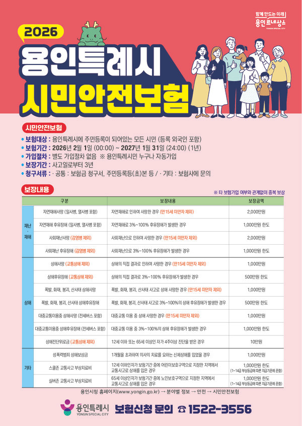 자세한 내용은 용인특례시 홈페이지 ‘시민안전보험’에서 확인할 수 있다.