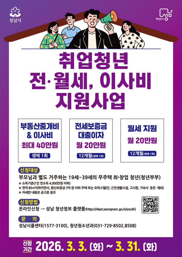 신청은 오는 3월 31일까지 ‘성남 청년정보 플랫폼’을 통해서 하면 된다.
