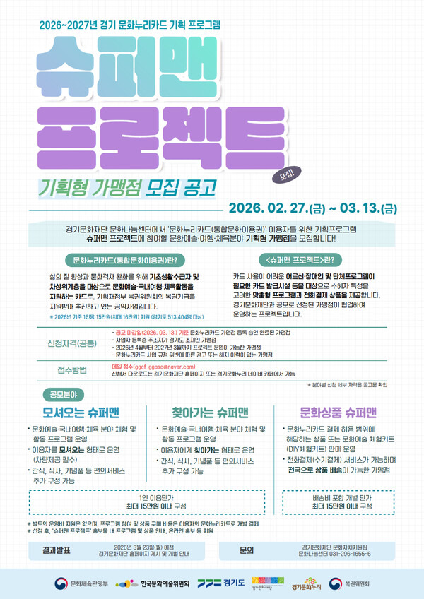 경기문화재단이 2026-2027년 경기지역 문화누리카드 기획 프로그램 '슈퍼맨 프로젝트'에 참여할 기획형 가맹점을 모집한다.