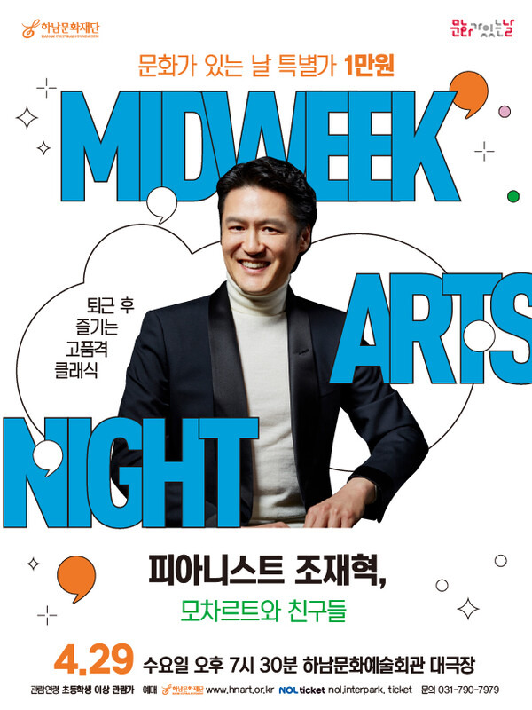 하남문화재단은 오는 4월 29일 오후 7시 30분, 하남문화예술회관 대극장에서 ‘문화가 있는 날’ 4월 기획공연 '피아니스트 조재혁, 모차르트와 친구들'을 선보인다. 이번 공연은 매월 마지막 주 수요일 운영되는‘문화가 있는 날’프로그램으로, 전석 1만 원 특별가로 진행된다.